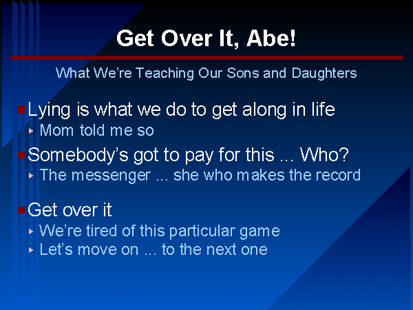 If honest Abe were to be reincarnated today, one wonders what he might think of the state of his union. Today we're just supposed to ignore deceit. In the venacular of our teenagers, we're supposed to "get over it!" And how many times did we hear from supposedly responsible adults -- indeed important elected officials -- the phrase "it's time to move on" ... as a lame excuse for failing to address alleged perjury forthrightly.