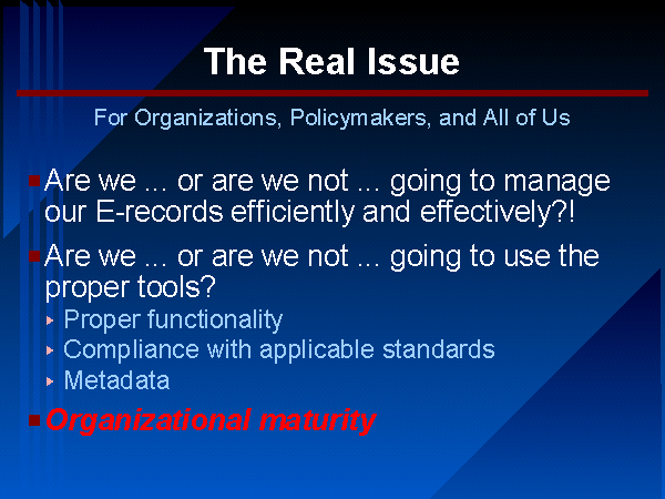 Unlike paper, the only real issue as far as E-records are concerned is whether we have the will to manage them efficiently, effectively, and lawfully. If so, the technology exists and no one needs to do anything other than their own job; record-keeping can and should be fully automated.