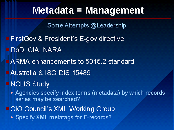 As you know, ARMA is pursuing enhancements to the 5015.2 standard. DoD and the CIA are also deliberating enhancements. What NARA is doing remains a bit of a mystery. In particular, NARA's draft strategic plan update was very weak in terms of performance objectives and measures. However, NARA's Electronic Records Archive (ERA) project is very encouraging. Moreover, in commenting on the refusal of the Supreme Court to hear the appeal of the GRS-20 litigation, the National Archivist said that NARA has already moved beyond what would have been required if the district court's decision had been upheld. So let's take him at his word and act accordingly.