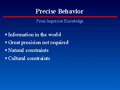 Information in the world may take the form of documentation (records) or design principles incorporated into products. Great precision is not required in interpersonal relationships or business partnerships if the overall impact of the relationship is positive for each of the partners. The phrase "good enough for government work" is reflective of the fact that precise behavior is not required for organizations that are protected from the rigors of a competitive marketplace, a condition in which some would argue that Microsoft also finds itself. Constraints are present in nature. For example, no one needs to be instructed to walk on the ground. With limited exceptions, gravity takes care of that. However, cultural constraints are far more malleable.