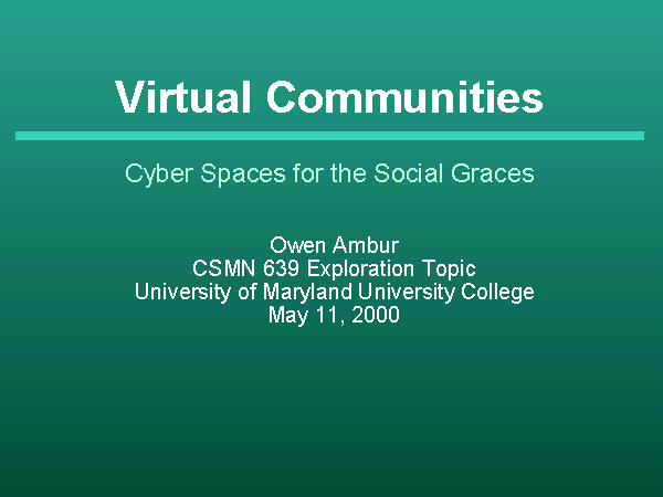 Last week we heard about Cybertown, into which people can immigrate as avatars, establish virtual homes, seek employment, shop, and engage in conversation. The focus of last week's presentation was on the visual aspects of the experience. As the presenters noted, the visual aspects are essentially a lie, but the social aspects can be compelling, if not addictive. The social aspects are the focus of this presentation.