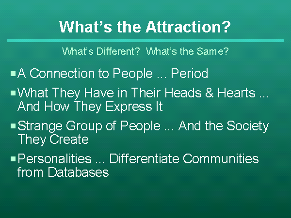 Horn says online communities provide: "... a connection to people. That's all any virtual community has to offer. Period, end of story. If you don't like the people on Echo, for instance, and what they have in their heads and hearts and how they express it, then there is no reason to stay. That's all we have. This strange group of people and society we have created. It's a community of personalities. If we didn't bring our personalities, what makes us unique, then it wouldn't matter who you talked to, one person would be much the same as another. You wouldn't be drawn to anyone or anyplace in particular and you might as well join a database." (p. 20)