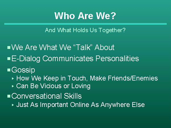 Horn says: "In cyberspace we have a running commentary on ourselves and our culture and all we know and don't know, which connects us to ourselves and each other, and everything in front of us. All the power and the allure of virtual communities is in this ongoing, evolving commentary, and the bonds that knock-down, drag-out fights that invariably arise when you give people a place to talk for as long and often as they like. The conversations we have online are our identity." (p. 70)