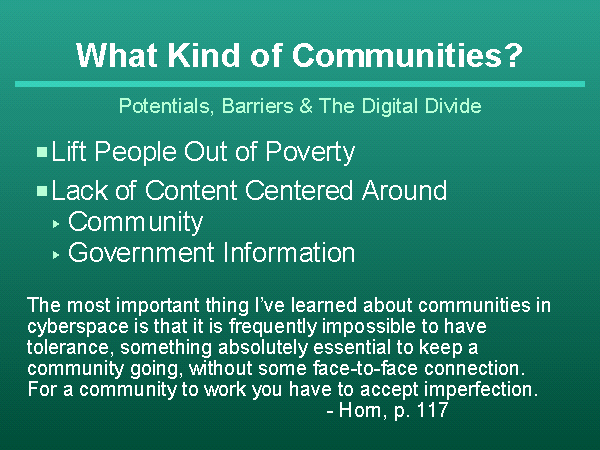 The article also cites a study (by Cheskin) suggesting: "a potential barrier to online participation through mainstream Internet web sites and portals is the lack of content centered around community and government information that speaks to particular needs and interests..." Reference: OMB Watcher Online, Vol. 1 No. 7, April 24, 2000
